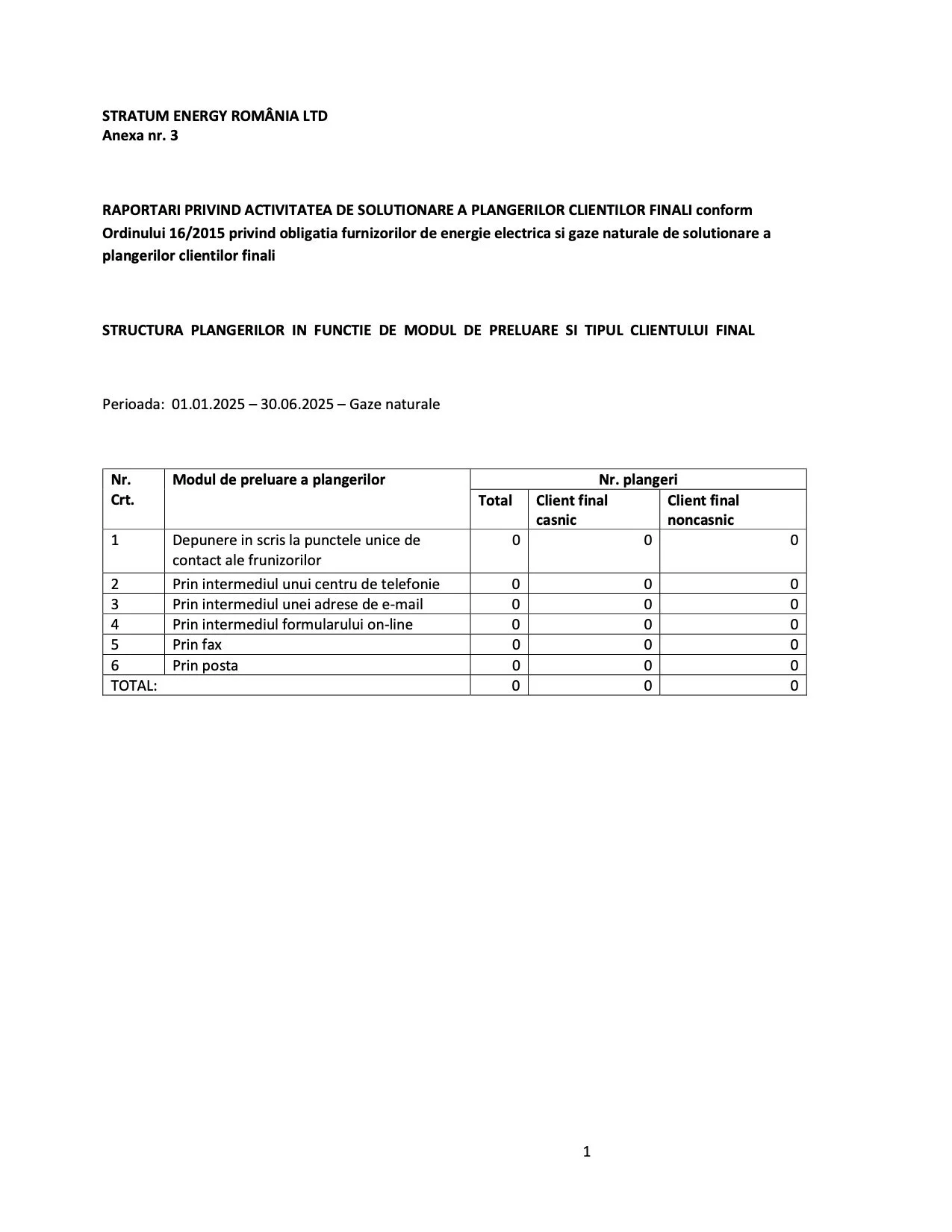 Raportare solutionare plangeri furnizare gaze naturale An 2025